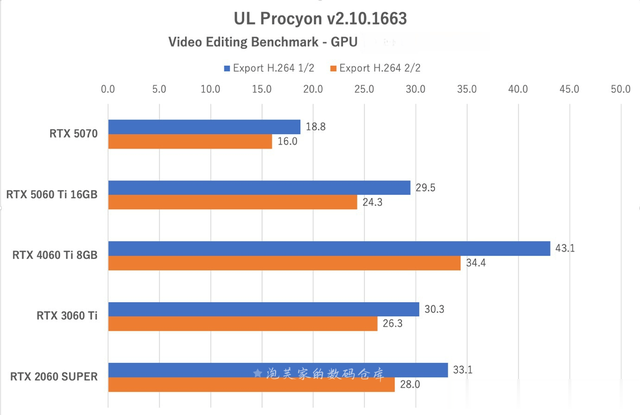 H.264规格下ULProcyon测试,5070的编码速度最快,而4060Ti 8GB版的表现令人意外——编码速度甚至慢于更旧的2060SUPER,在参测显卡中排名垫底。从单个视频的编码时间来看,5060Ti 16GB版与3060Ti仅有细微差距,但4060Ti8GB版的处理时间有时会长达近30秒