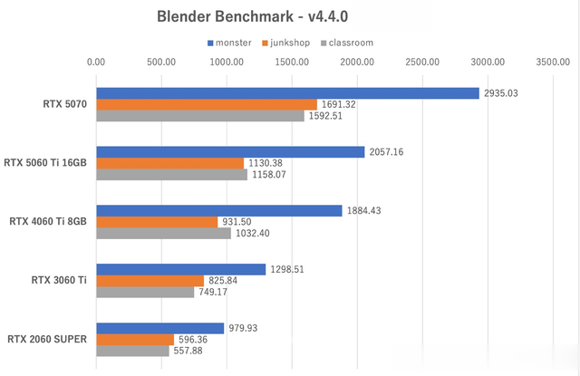 5070依然展现出压倒性优势,而5060Ti1 6GB版与4060Ti 8GB版的表现差距不大。由于Blender的渲染处理更依赖运算单元数量而非显存带宽,5060Ti的SM单元数量仅比4060Ti增加不到6%,导致其在这项测试中并未展现出明显优势。