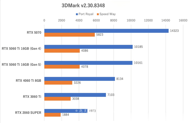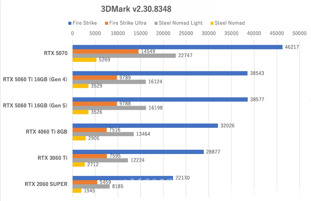 5060Ti的得分约为5070的71%~74%,随着绘制负载的增加,差距也在扩大。相比4060Ti仅提升约15%,与4070的差距也扩大到约11%~15%,不过,与3060Ti的差距约为29%~35%。