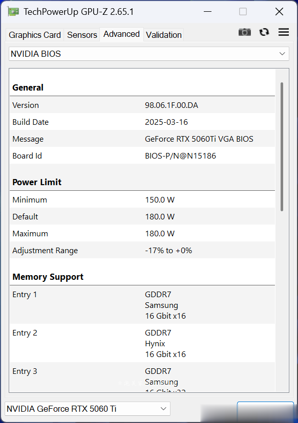整体功耗,5060Ti16GB略低于5070。如果只看TBP,功耗更接近4060 Ti8GB。本次测试使用的5060Ti 16GB卡不是公版型号,因此平均TBP非常接近标称TGP值180W。