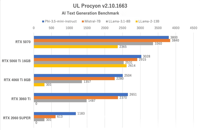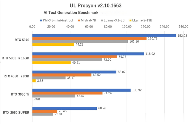 Phi-3.5-mini-instruct最小,LLama-2-13B最大;5070凭借更高的硬件规格在综合得分上领先,但在LLama-2-13B模型中,16GB显存的5060Ti16GB版因显存容量优势,token牌响应时间反超5070(12GB显存)