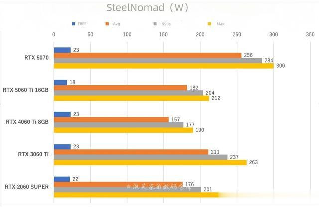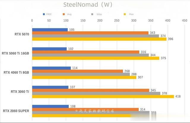 接下来看看功耗如何,运行3DMarkSteelNomad进行测试。空闲时的功耗是闲置三分钟时的平均值。