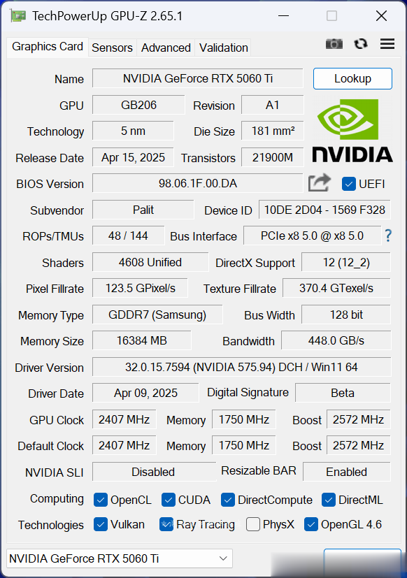 GPU-Z看到显存位宽为128bit,采用GDDR7显存类型,能够保证448 GB/s的显存带宽。另外是PCIE5.0x8的接口。
