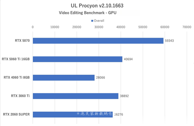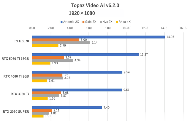 5060Ti 16GB版在Rhea4X超分辨率中达到11.27FPS,较4060Ti8GB版(9.54FPS)提升18%,延续了显存带宽优势。Chronos4X慢动作处理中,5060Ti 16GB版20.73FPS,略低于5070(25.68FPS),但远超旧世代显卡(3060Ti仅19.97FPS)。