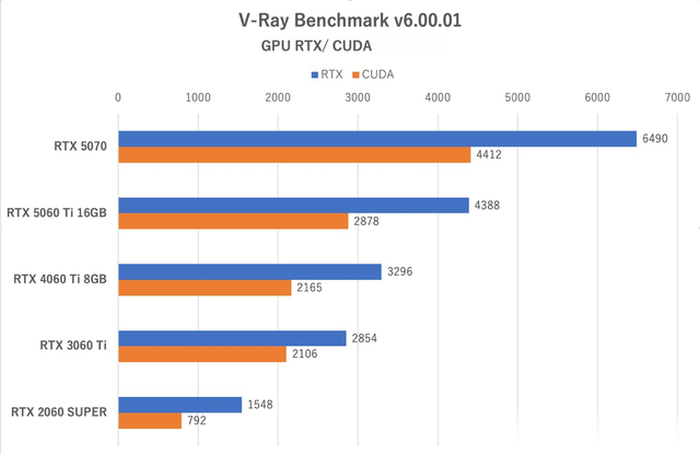 在同时支持GPU加速的和CUDA两种模式测试中,与5070此前的评测结果相比,模式得分保持稳定,而CUDA模式的性能表现终于回归正常水平。5060Ti 16GB版的得分约比5070低35%,这与两者的SM单元数量比(48:36)高度吻合,充分体现了硬件规模差异对性能的直接影响。5060Ti 16GB版的得分比4060Ti 8GB版高出约33%。考虑到其SM单元数量仅微增6%,这种性能差距很可能由显存带宽优势带来。值得注意的是,4060Ti8GB版与3060Ti的得分几乎没有拉开差距